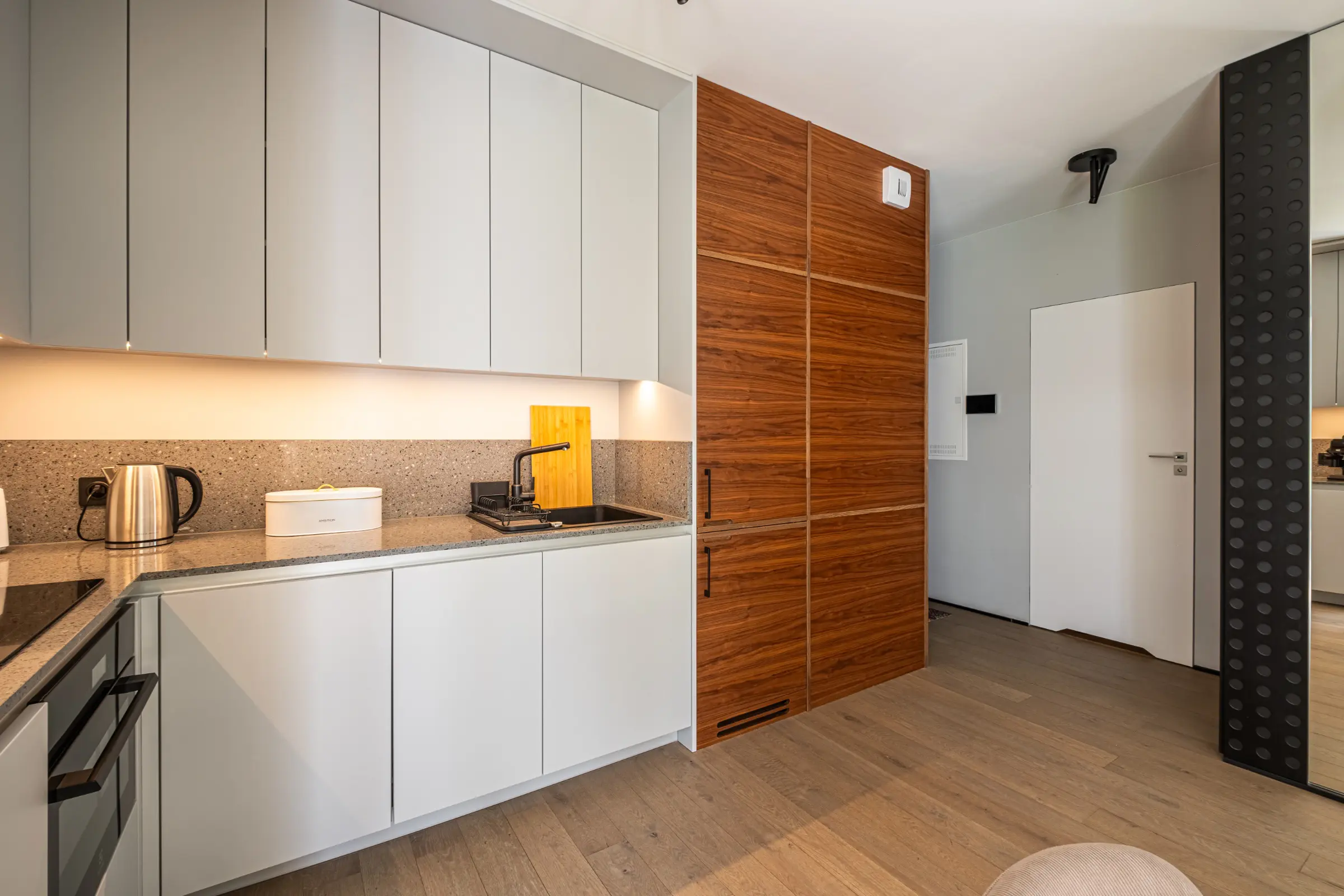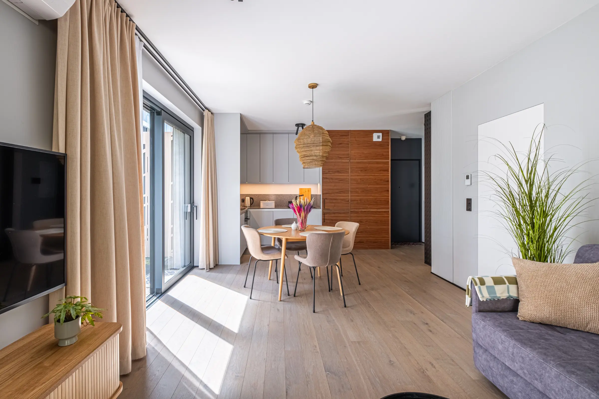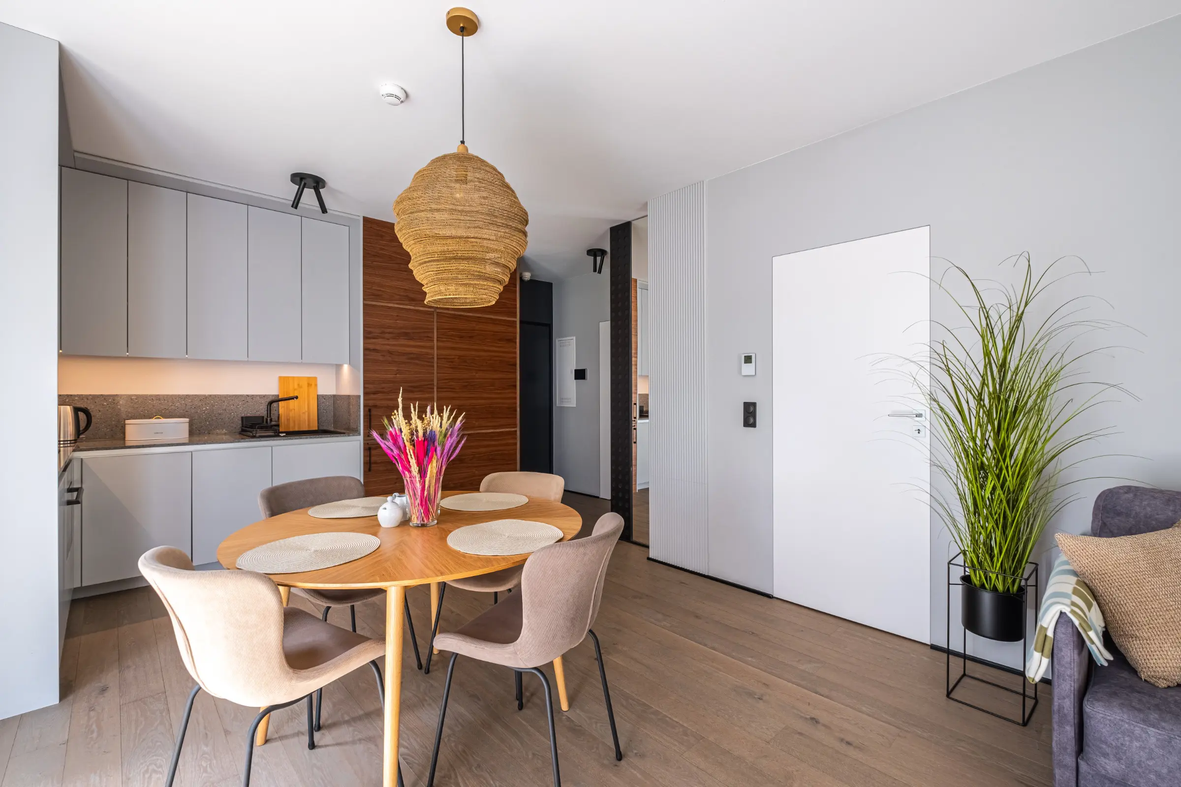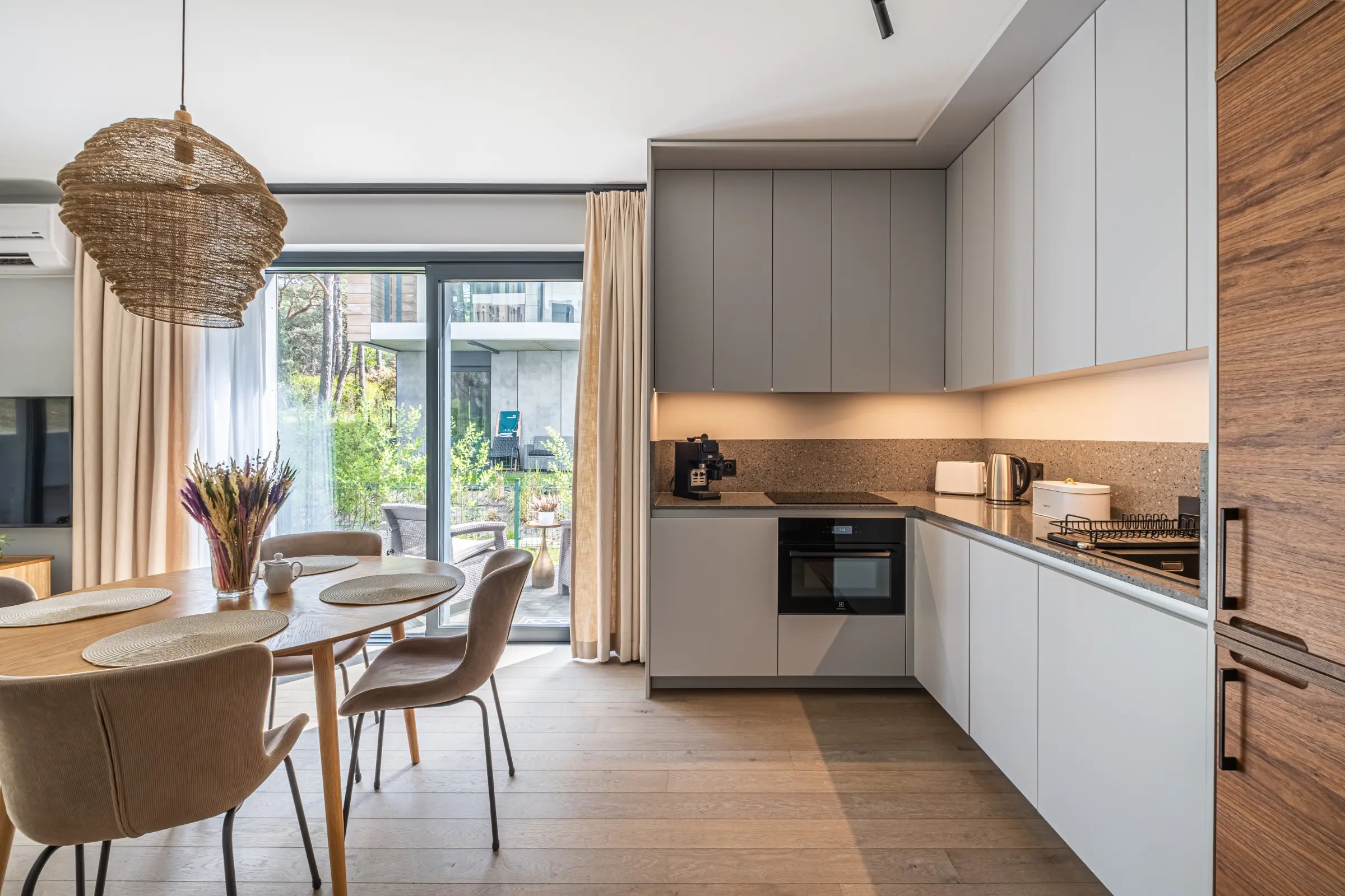 z mikrofalówką, płyta indukcyjna, czajnik, ekspres do kawy, toster,  naczynia m.in.: garnki, patelnie, naczynia żaroodporne, sztućce, szklanki, kubki do herbaty, filiżanki do kawy, zestaw talerzy, korkociąg, deska do krojenia, gąbka do zmywania, kapsułki do zmywarki itp. W samym sercu aneksu kuchennego umiejscowiliśmy drewniany stół wraz z czterema krzesłami, podłoga wykonana jest z drewna.