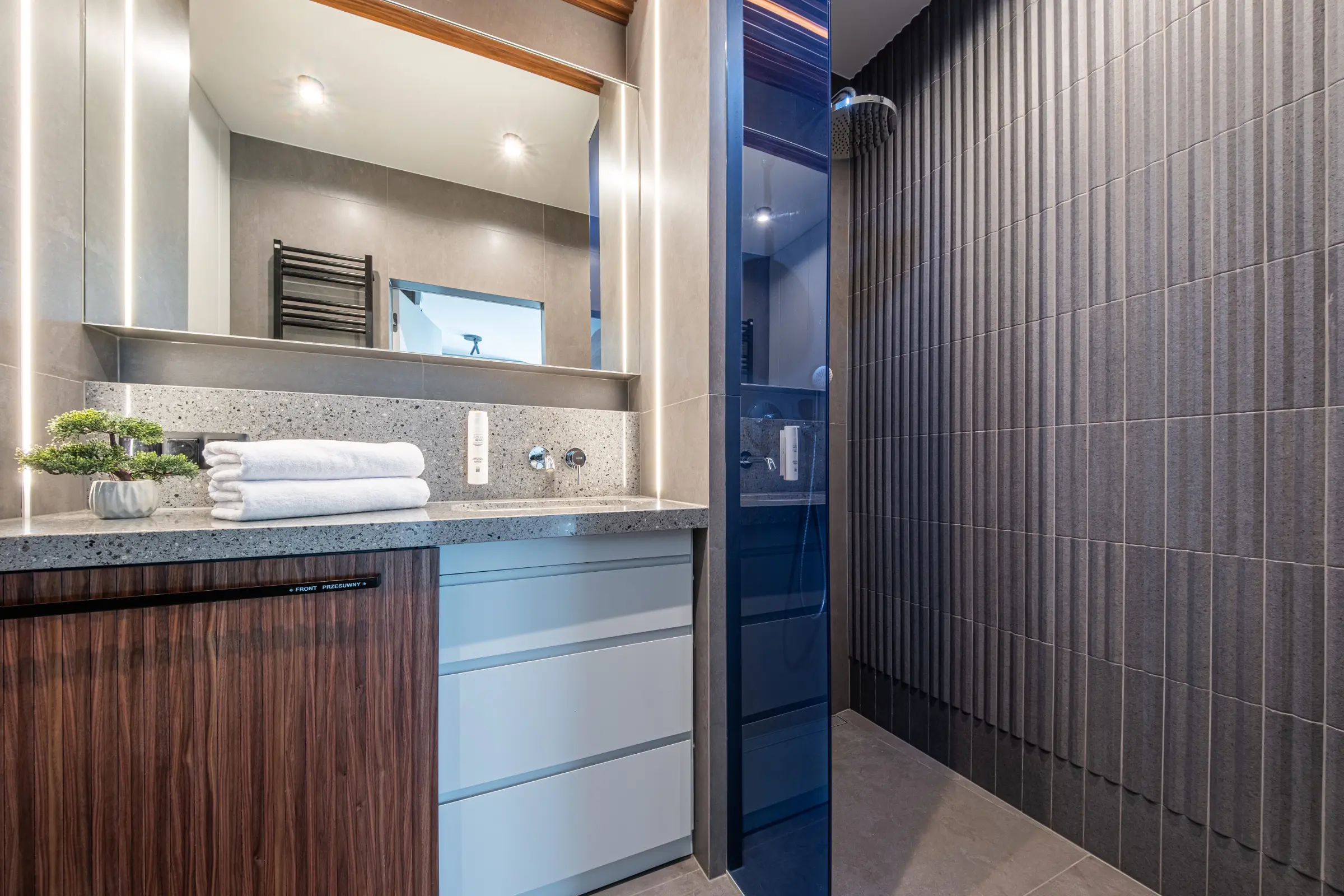 Łazienka wykończona nowocześnie z prysznicem typu walk-in, kosmetyki klasy hotelowej, ręczniki, suszarka do włosów, pralka na kapsułki do prania (kapsułki na wyposażeniu) , kosz na śmieci, papier toaletowy itp