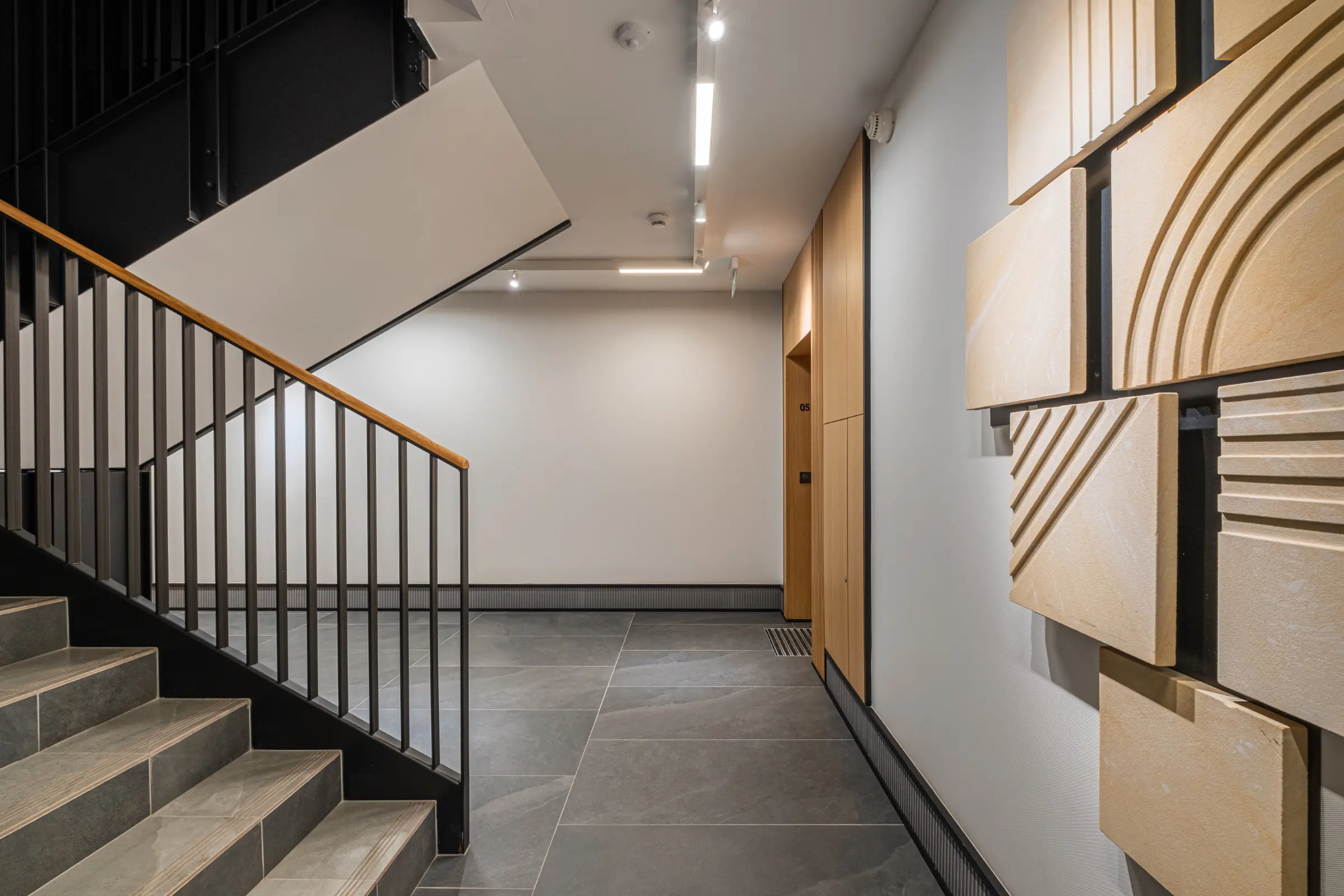 Przedpokój został wyposażony w dużą pojemną szafę, wraz z drewnianymi wieszakami na ubrania i półkami na buty, podłoga wykonana jest z drewna