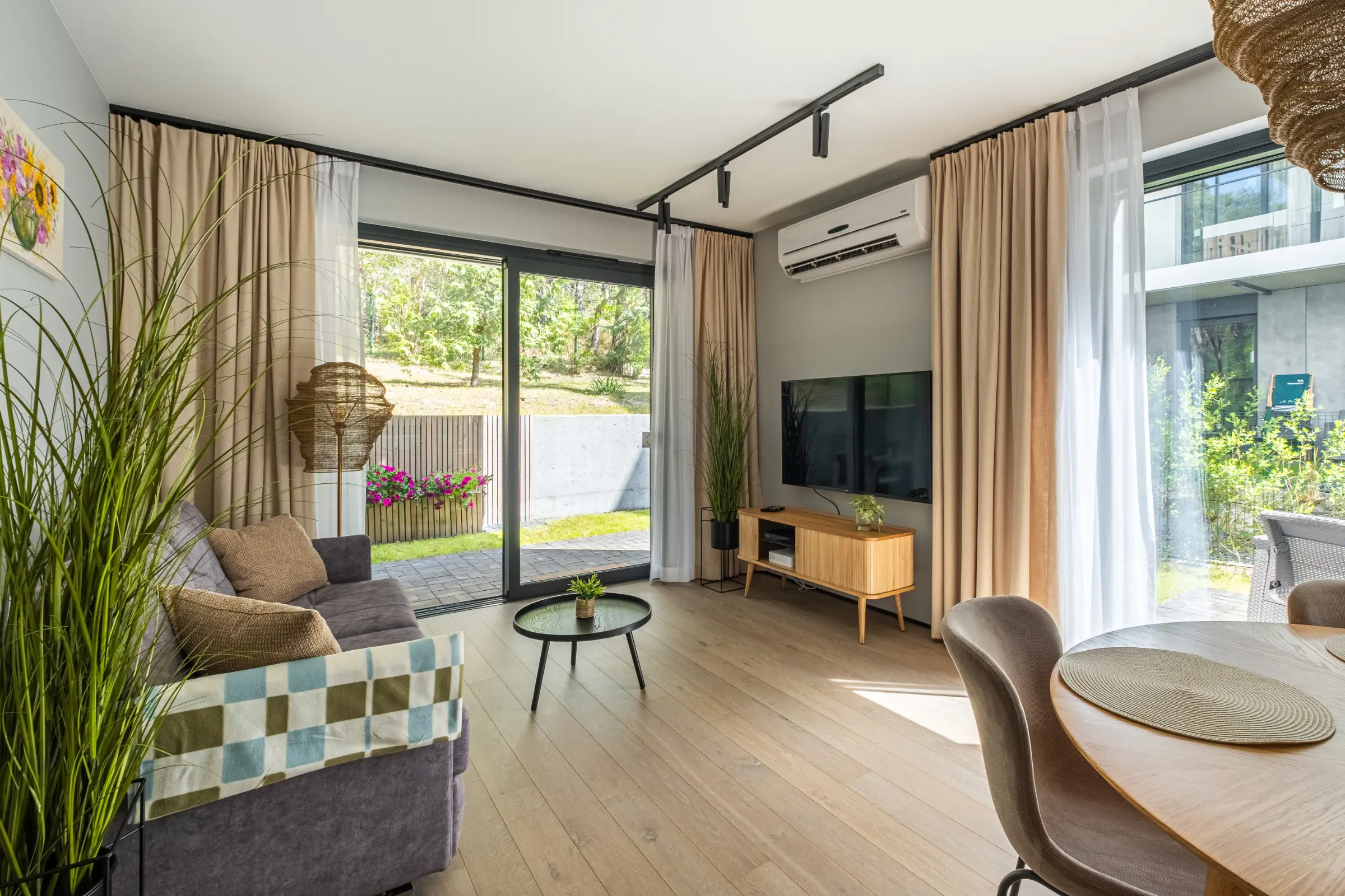 W salonie znajduje się  rozkładana sofa (140×200 cm) z funkcją spania dla dwóch osób, szafką rtv, telewizorem  smart TV, wifi, oraz stolikiem kawowym, podłoga wykonana jest z drewna.