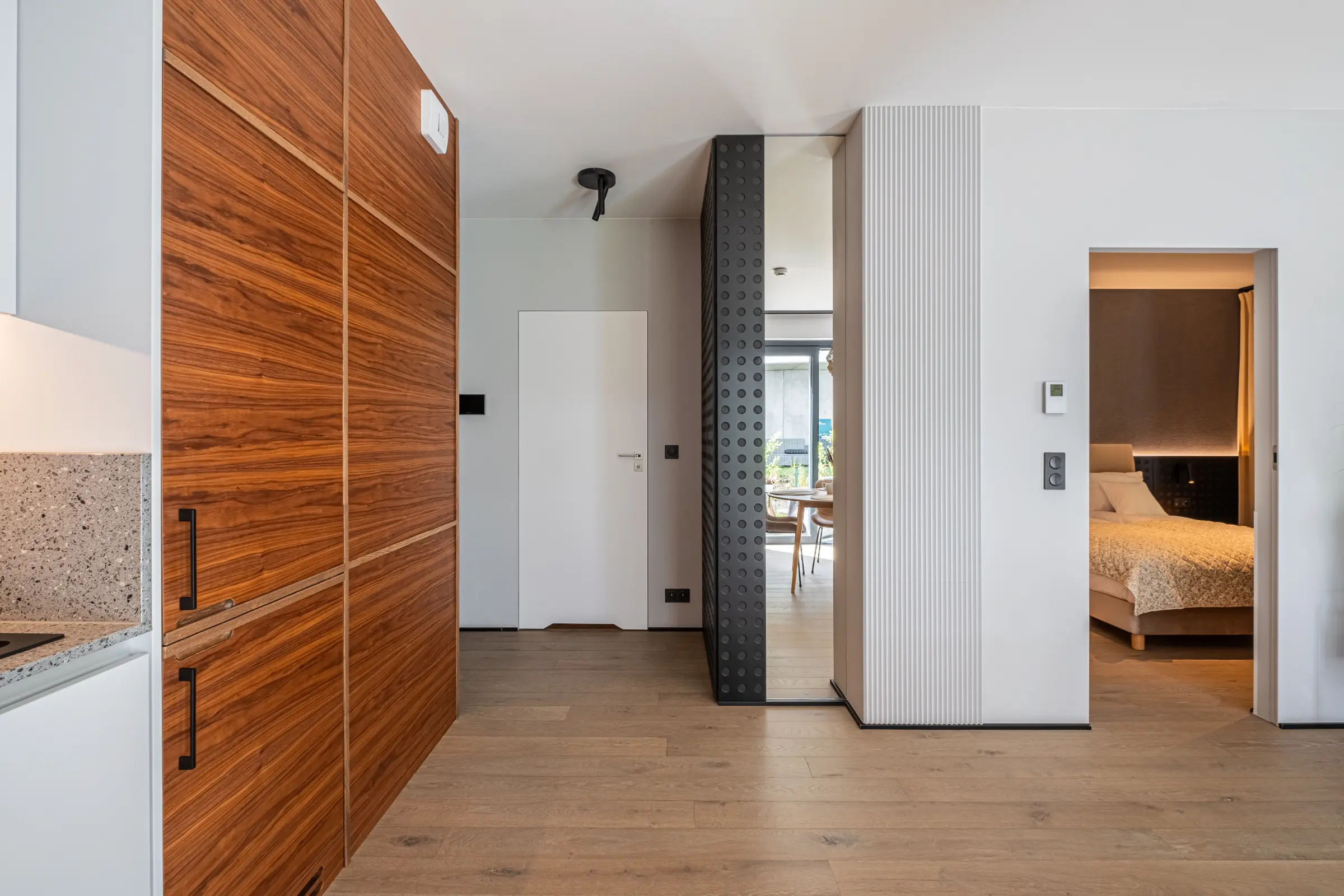 Przedpokój został wyposażony w dużą pojemną szafę, wraz z drewnianymi wieszakami na ubrania i półkami na buty, podłoga wykonana jest z drewna