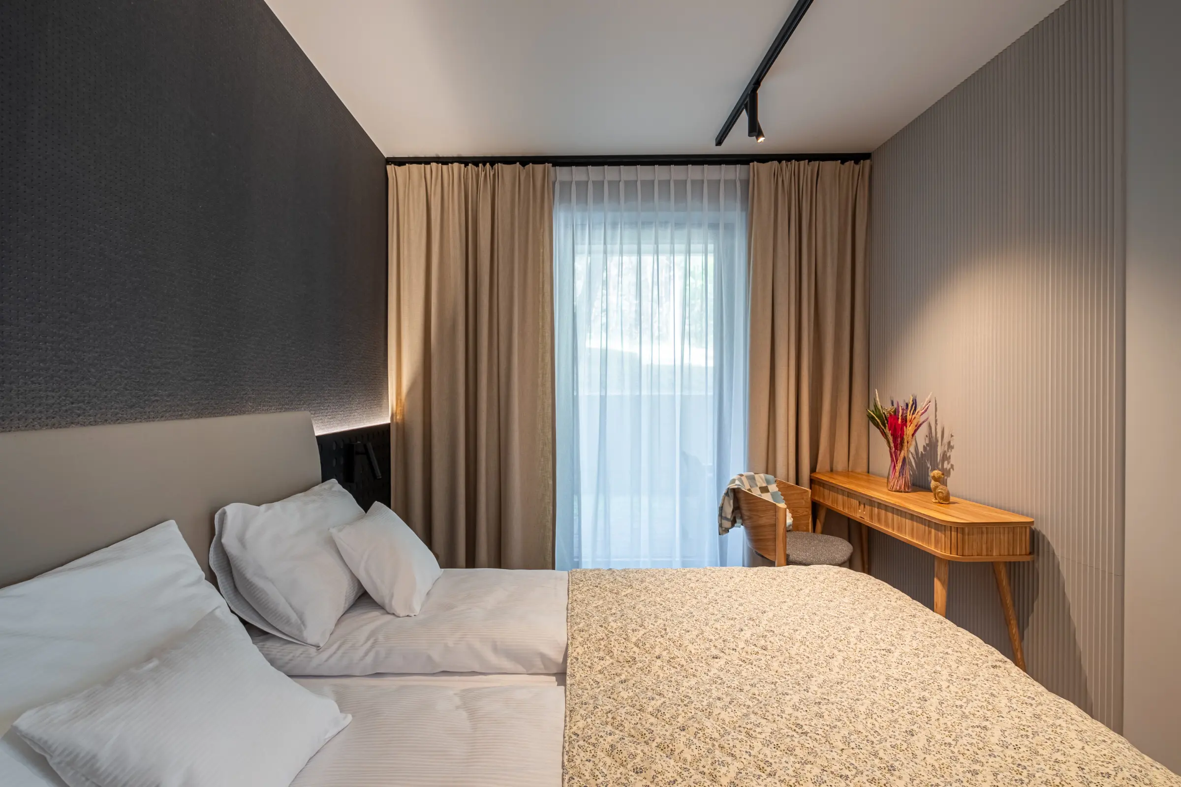 Sypialnia wyposażona jest w: jedno duże łóżko małżeńskie (160×200 cm) hotelową galanterią, dwa stoliki nocne,  drewniane biurko z krzesłem oraz dużą wygodną szafą, podłoga wykonana jest z drewna.